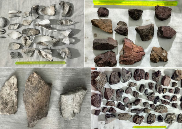 வெளிர் சாம்பல் நிற 11.0கிராம்/மிலி என்ற அடர்த்தி கொண்ட ஈயம் 92.12%, செம்பு 6.94%, வெள்ளி 0.94% கலந்த பிறை வடிவ ஆபரணம், எலும்புகளின் எச்சங்கள், பிளின்ட் எனப்படும் நுண்கருவிகள் செய்ய பயன்படும் படிகக்கற்கள், புதை கிணறு, குழாய் மற்றும் கலன்களின் சிதைவுகள், பானை ஓட்டு குறியீடுகள், பச்சைநிற மரகதம் போன்ற ரத்தின சிதைவுகள், வித விதமான தெறித்த மற்றும் வடிந்த உலோக வார்ப்புகளின் எச்சங்களை கொண்ட உருக்கு உலையின் கட்டுமான சிதைவுகள்,