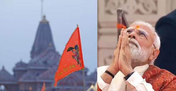 உத்தரப் பிரதேச மாநிலம், அயோத்தியில் பிரம்மாண்டமாகக் கட்டப்பட்டுள்ள ராமா் கோயிலின் கட்டுமானம் நிறைவடைந்துள்ளது. இதனையடுத்து, 191 அடி உயரமுள்ள பிரதான கோபுரத்தின் உச்சியில் 20 அடி நீளமும், 10 அடி அகலமும் கொண்டு தயாரிக்கப்பட்ட சிறப்புக் கொடியைப் பிரதமர் மோடி இன்று ஏற்றி வைத்தார்.