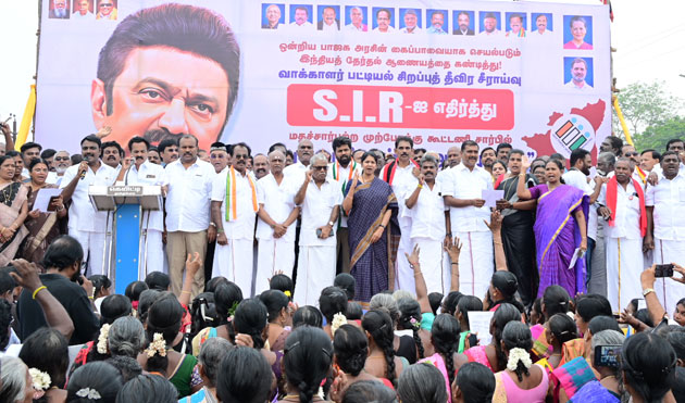 ஆர்ப்பாட்டத்தில் கனிமொழி எம்பி பேசுகையில், வாக்குரிமை என்பது நமது அடிப்படை உரிமை. அது இல்லையென்றால் ரேஷன், உள்ளிட்ட அடிப்படை தேவைகள் கிடைக்காது. பிகாரில் இஸ்லாமியர், தலித், பெண்களின் வாக்குரிமை பறிக்கப்பட்டுள்ளது. தமிழக மக்கள் பாஜகவிற்கு வாக்களிக்கமாட்டார்கள் என்பதால் தமிழகத்தின் அடிப்படை உரிமைகளை பாஜக அரசு பறித்து வருகிறது. இதன் மூலம் தமிழகத்தின் தொகுதிகளும் பறிபோகும் வாய்ப்புள்ளது. 3 முறை வாக்களிக்காவிட்டால் பிரஜையின் உரிமை பறிக்கப்படும். அதுபோல தமிழகத்திலும் நடத்த மத்திய பாஜக அரசு திட்டமிட்டுள்ளது. அவர்களுக்கு அதிமுக நல்ல அடிமைபோல செயல்பட்டு வருகிறது என்றார்.
